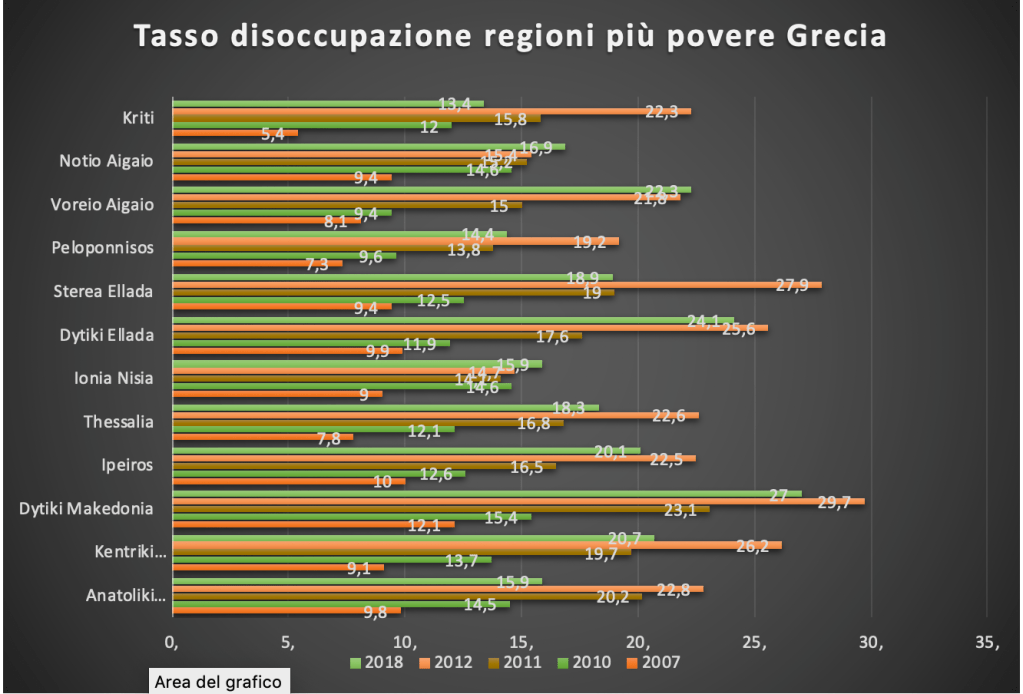 Nei seguenti grafici abbiamo considerato il tasso di disoccupazione dal 2007 a oggi nelle regioni economicamente più arretrate di Grecia, Spagna, Italia e Portogallo. Ancora una volta risulta estremamente evidente quanto la crisi non sia superata e quanto la disoccupazione sia ancora a livelli seri in tutte le aree considerate.
